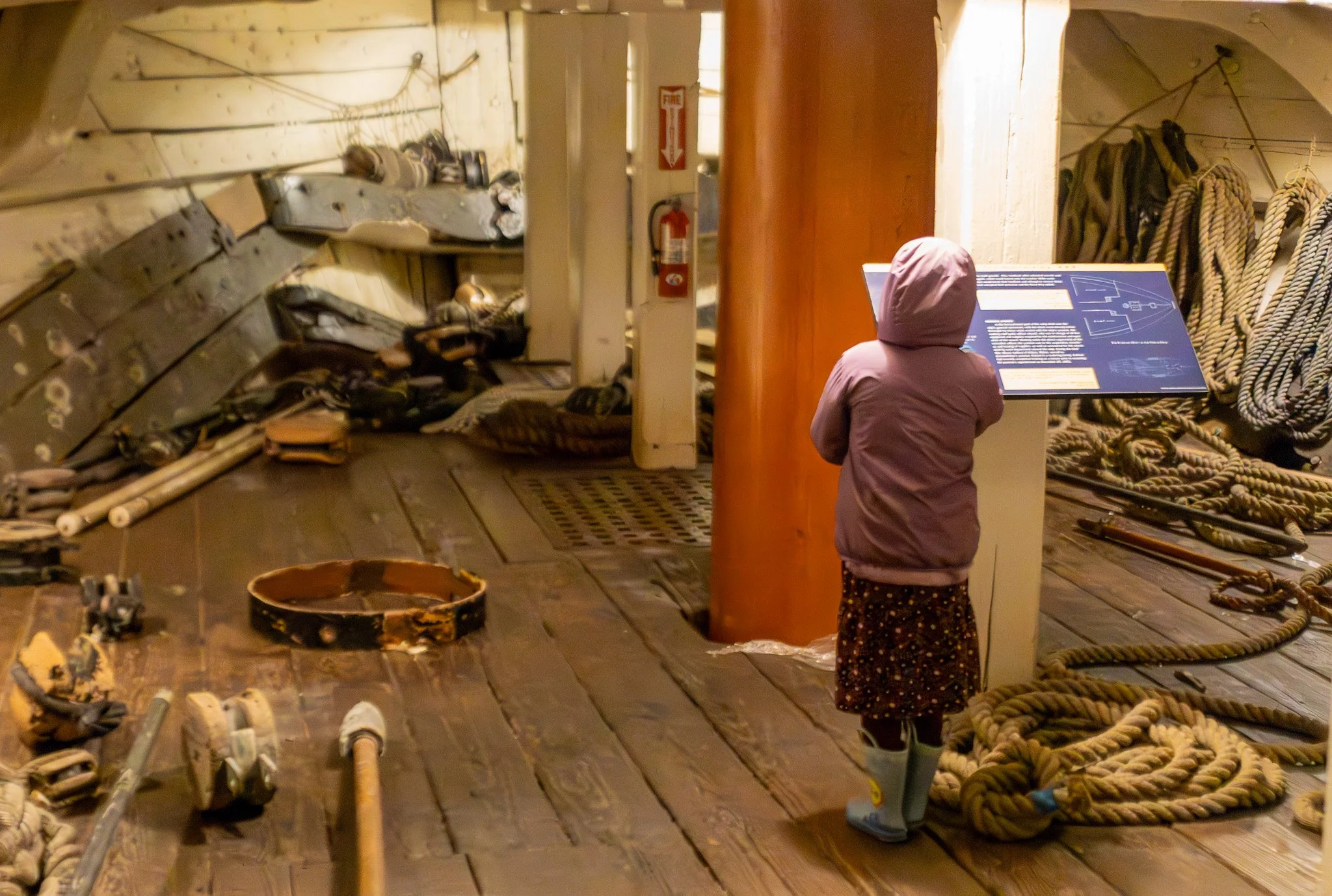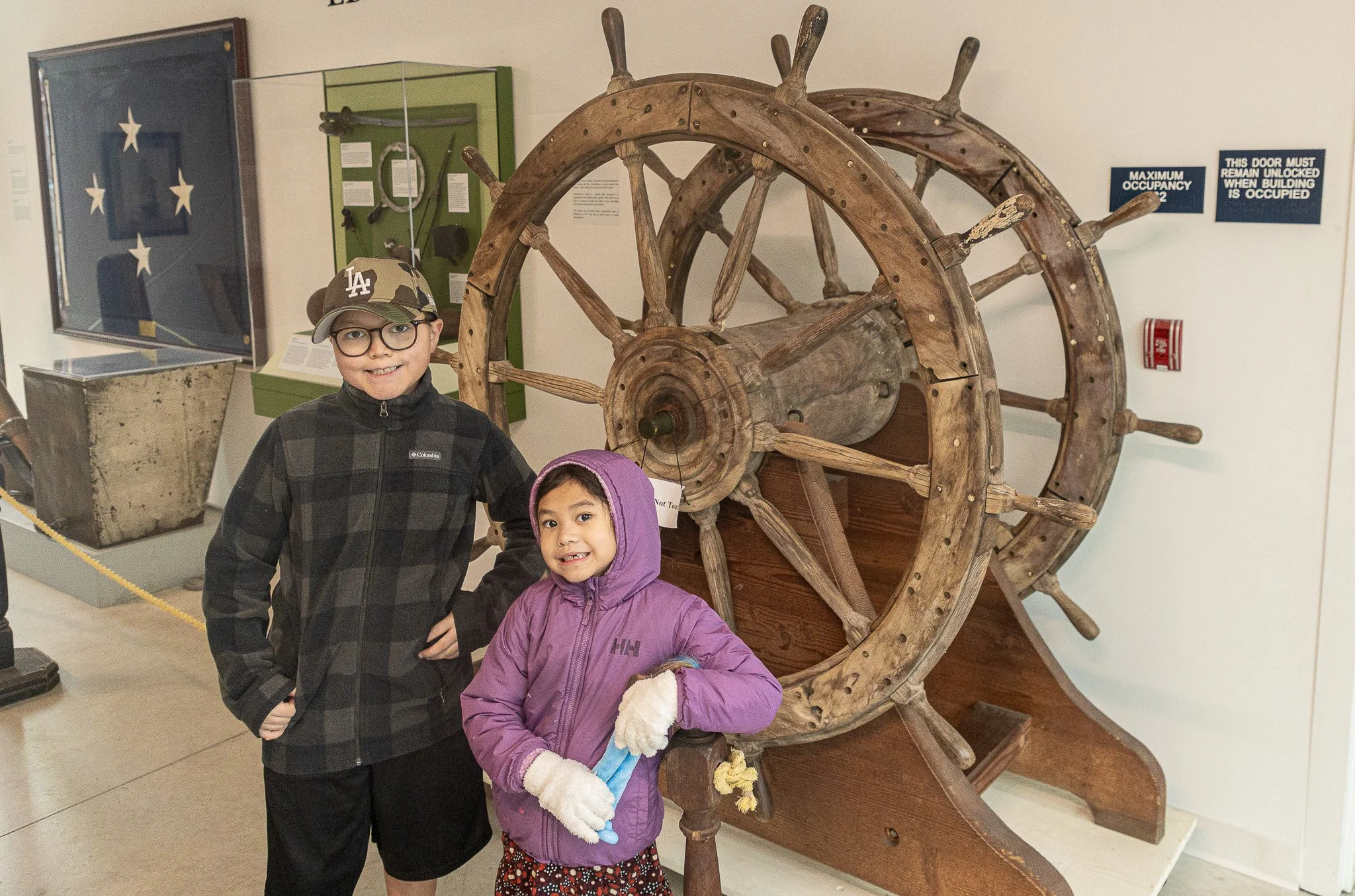Aiden playing with the wheel on the USCG Lightship Chesapeake.