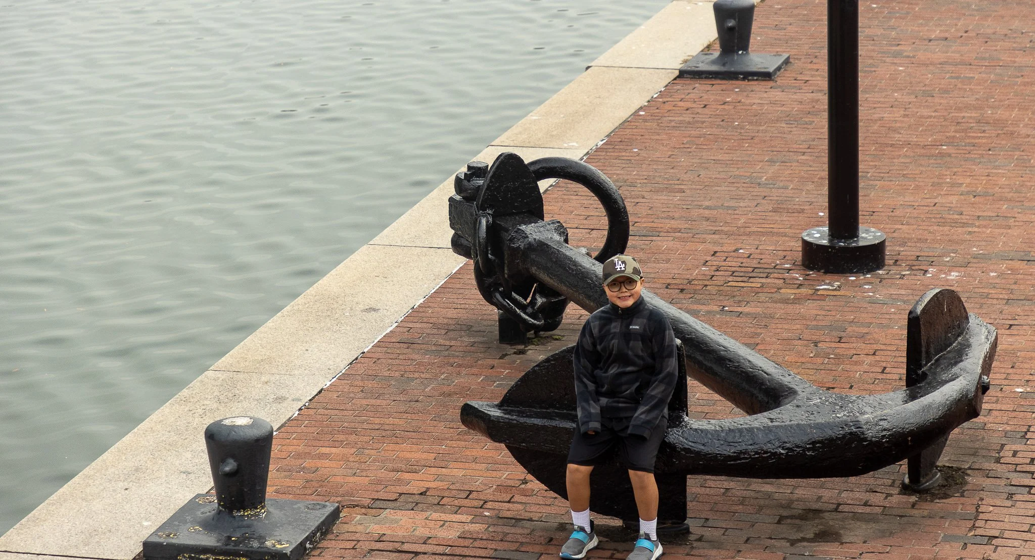 Aiden and Olivia sitting on an anchor in the Inner Harbor.